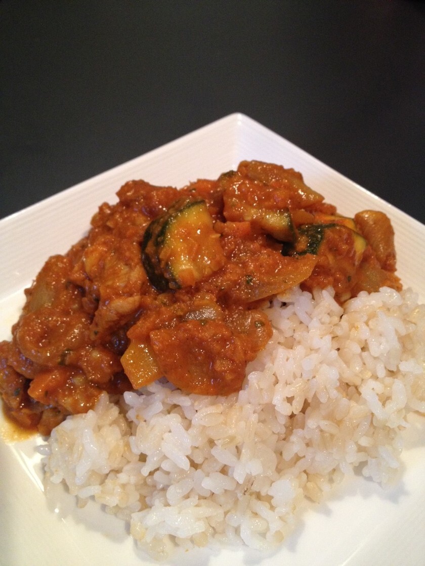 1のたまねぎが透き通ってきたら、ズッキーニと鶏肉を加え、更に炒めます。