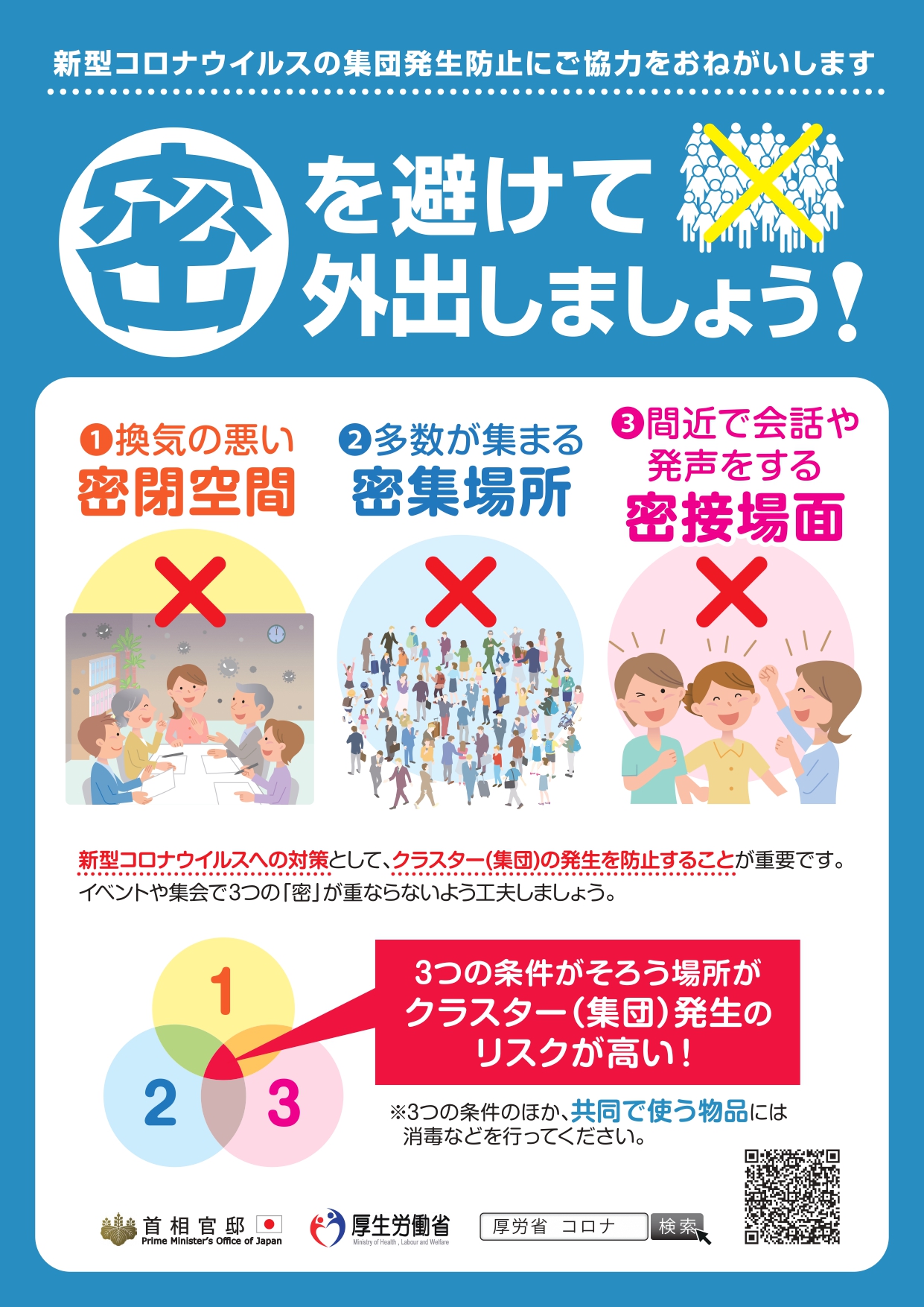 これまでに国内で感染が確認された方のうち重症・軽症に関わらず約80%の方は、他の人に感染させていない一方で、一定の条件を満たす場所において、一人の感染者が複数人に感染させた事例が報告されています。集団感染が生じた場の共通点を踏まえると、特に、1.密閉空間(換気の悪い密閉空間である)、2.密集場所(多くの人が密集している)、3.密接場面(互いに手を伸ばしたら届く距離での会話や共同行為が行われる)という3つの条件のある場では、感染を拡大させるリスクが高いと考えられています。