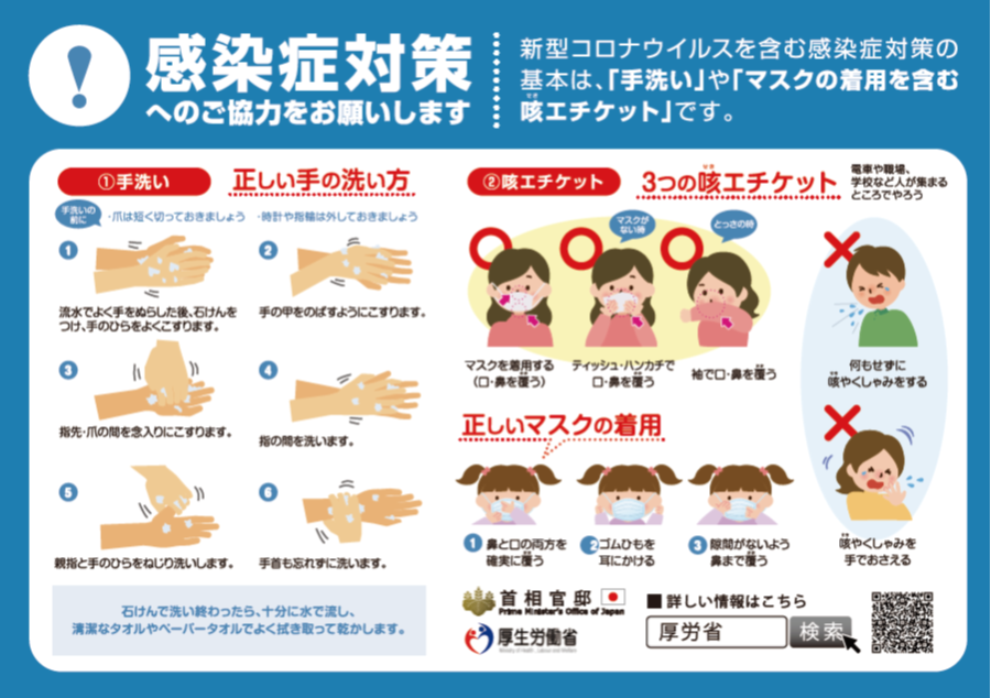 風邪や季節性インフルエンザ対策と同様にお一人お一人の咳エチケットや手洗いなどの実施がとても重要です。感染症対策に努めていただくようお願いいたします。風邪症状があれば、外出を控えていただき、やむを得ず外出される場合にはマスクを着用していただくようお願いします。